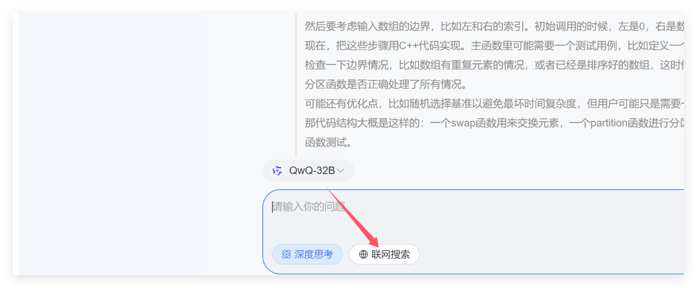接下来我们就可以直接体验了,我们来体验一下深度思考例如输入:用C++帮我写一个快速排序