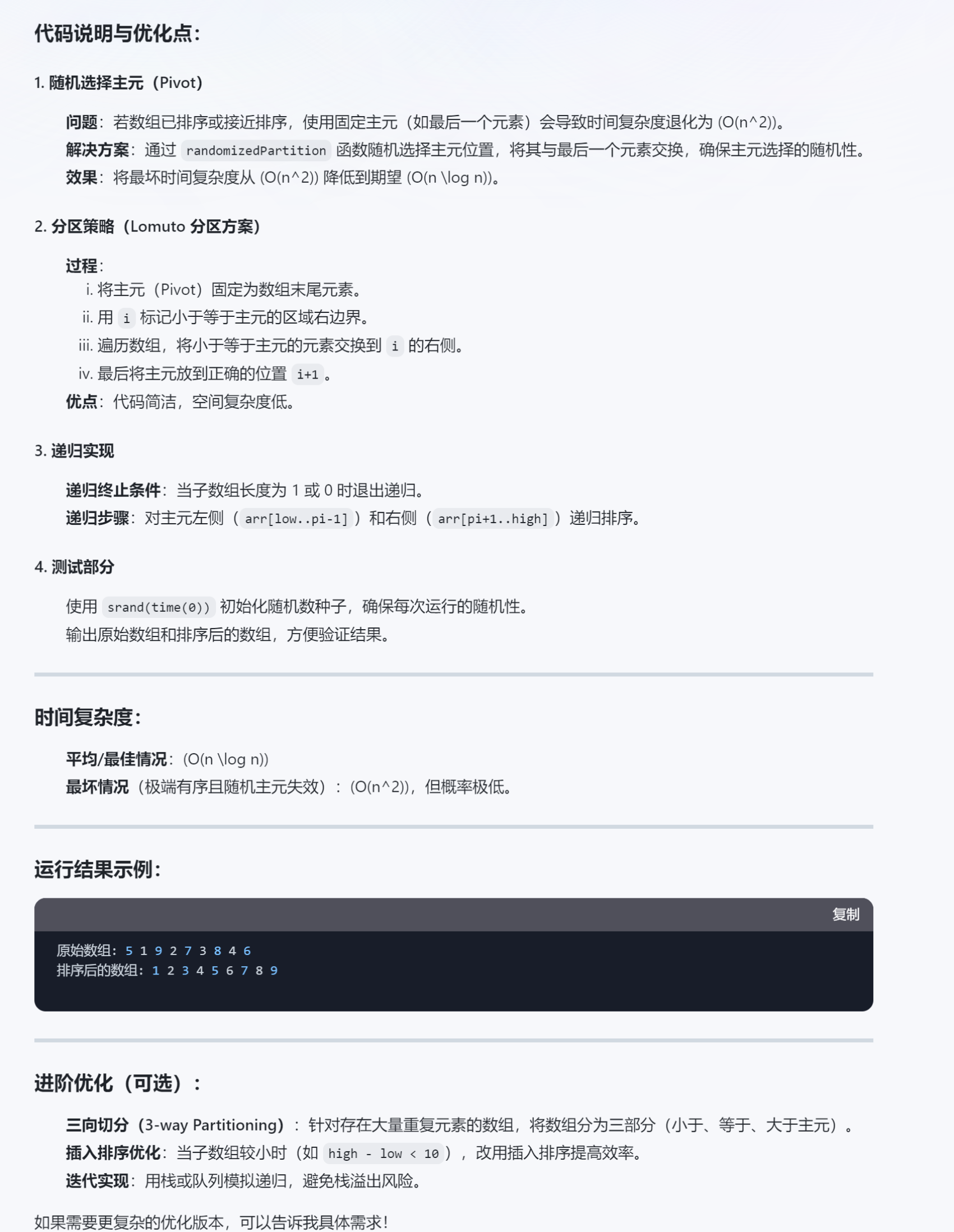 // 1. 随机选择主元位置(降低有序数组的最坏时间复杂度)int pivotIndex = low + rand() % (high - low + 1); // 随机选择 [low, high] 区间的一个索引swap(arr[pivotIndex], arr[high]); // 将随机选择的主元与最后一个元素交换int pivot = arr[high]; // 现在以最后一个元素作为主元int i = low - 1; // 标记小于等于主元的区域右边界// 2. 遍历数组,将小于等于主元的元素移动到左侧for (int j = low; j < high; j++) {