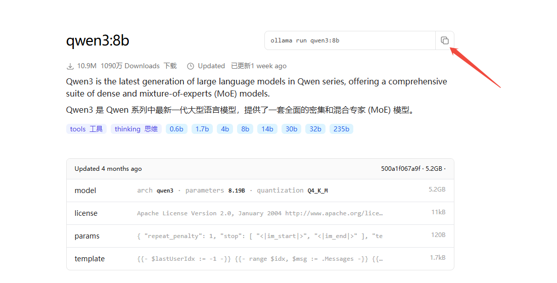 这里我们以qwen3:8b为例,复制命令后打开cmd,粘贴并回车