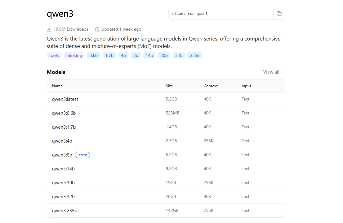 访问 https://ollama.com/library,这里有模型仓库。以千问(Qwen)为例: