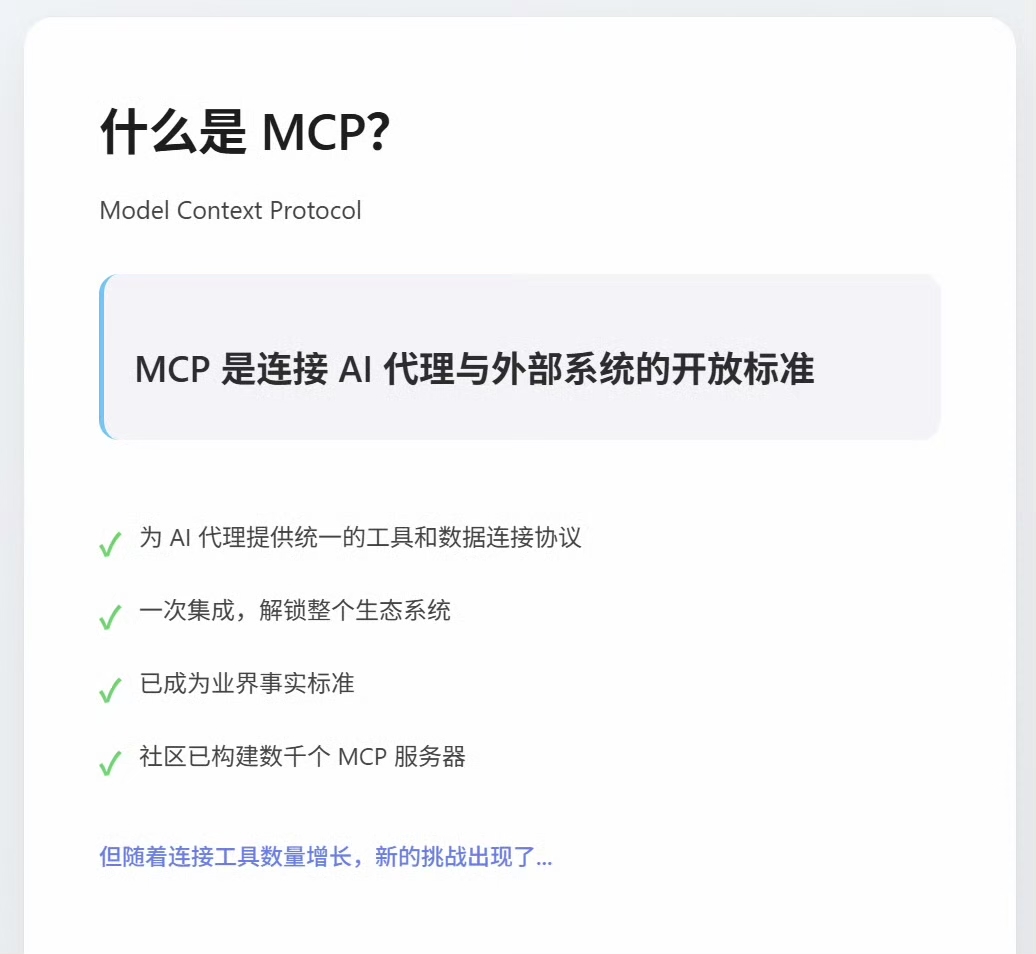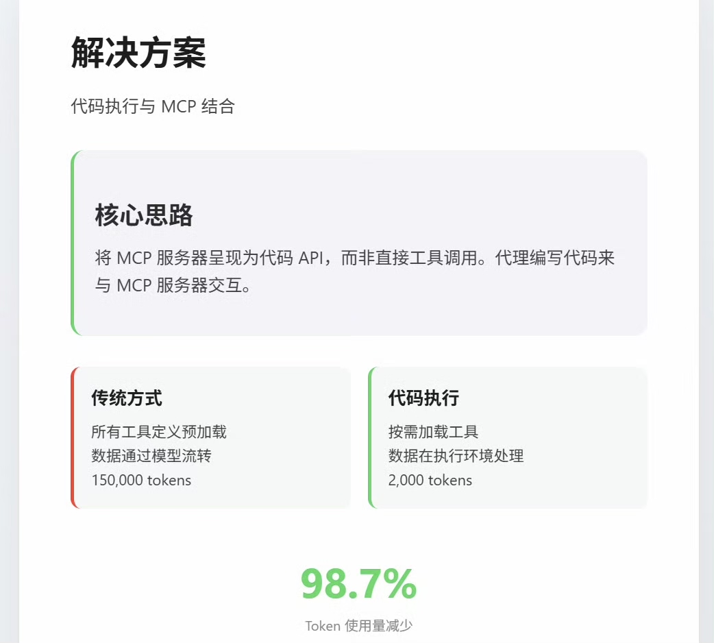 MCP 为代理连接大量工具和系统提供了基础协议,但随着服务器连接数量增加,工具定义和结果会消耗过多 tokens,降低代理效率。