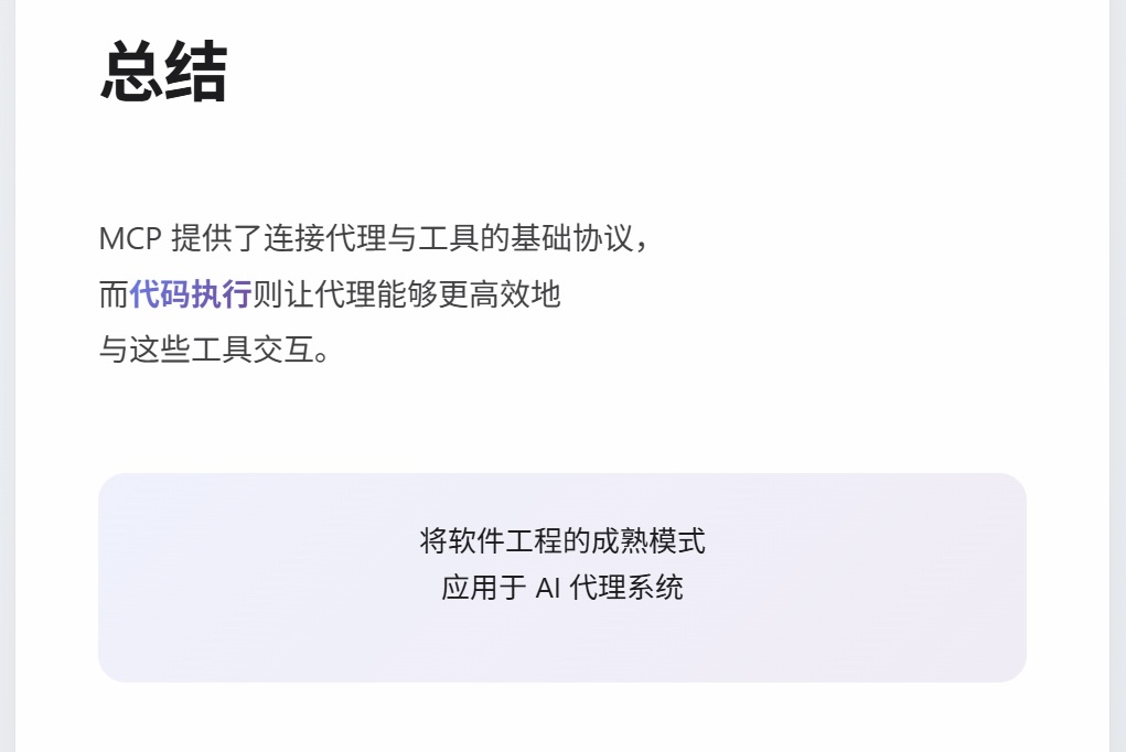 尽管 “上下文管理、工具组合、状态持久化” 等问题看似新颖,但软件工程领域已有成熟解决方案。代码执行将这些成熟模式应用于 AI 代理,让代理通过熟悉的编程结构与 MCP 服务器高效交互。若你采用了该方案,欢迎向 MCP 社区分享你的实践经验。