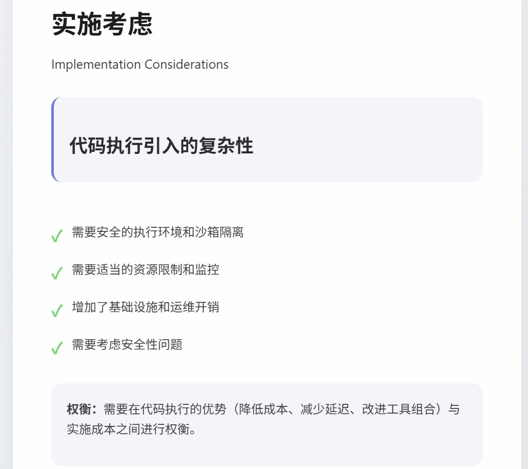 代码执行虽有诸多优势,但也引入了新的复杂度:运行代理生成的代码需安全执行环境,包括适当的沙箱隔离、资源限制和监控。这些基础设施需求会增加运维成本和安全考量,而直接工具调用则无此问题。因此,在采用该方案时,需权衡 “代码执行的收益(降低 token 成本、减少延迟、优化工具组合)” 与 “实现成本”。