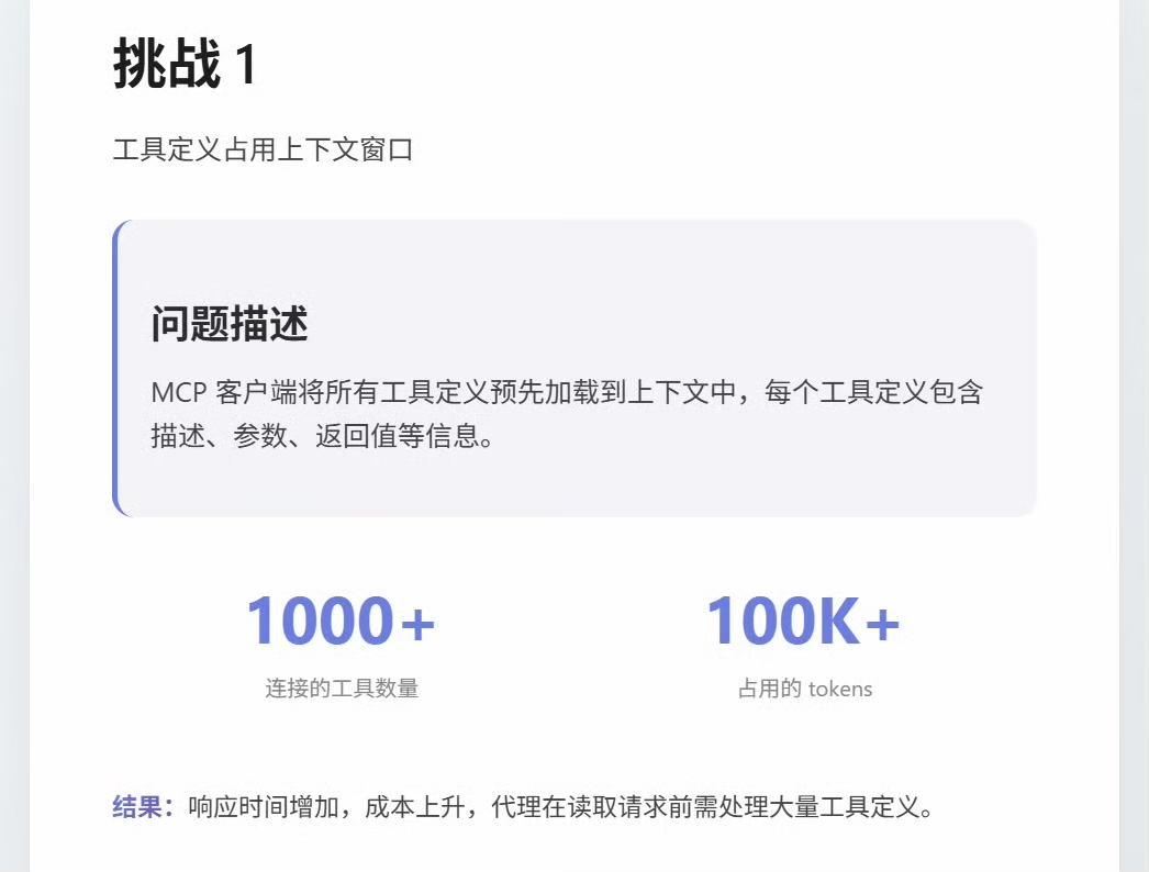 工具描述会占用大量上下文窗口空间,增加响应时间和成本。当代理连接数千个工具时,仅处理工具定义就需消耗数十万 tokens,之后才能开始解析用户请求。