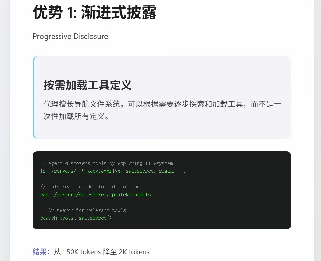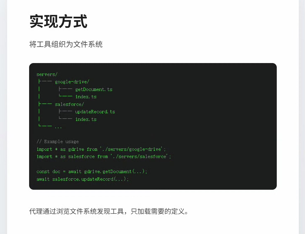 代理通过浏览文件系统发现工具:先列出./servers/目录找到可用服务器(如google-drive、salesforce),再读取当前任务所需的工具文件(如getDocument.ts、updateRecord.ts)以理解工具接口。这种 “按需加载” 模式将 tokens 消耗从 15 万个降至 2000 个,时间和成本节省达98.7%。
