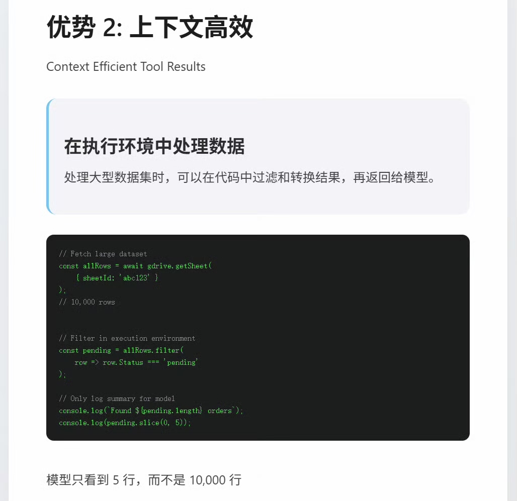 通过代码执行与 MCP 结合,代理能更高效地使用上下文(按需加载工具、预处理数据、单步执行复杂逻辑),同时还能带来安全和状态管理层面的额外收益。