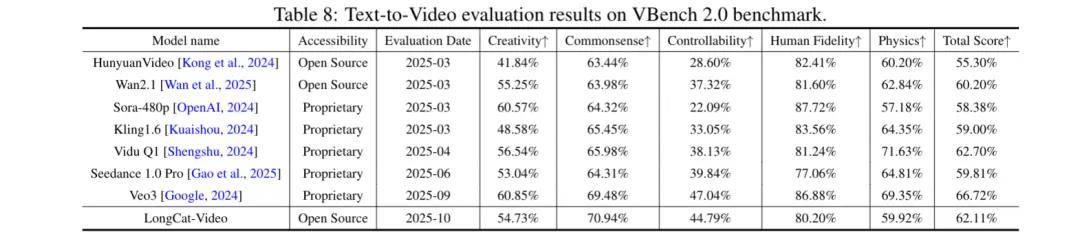 值得注意的是,LongCat-Video在常识性维度(运动合理性、物理定律遵循)上处于第一的领先优势,凸显出该模型优秀的物理世界建模能力。