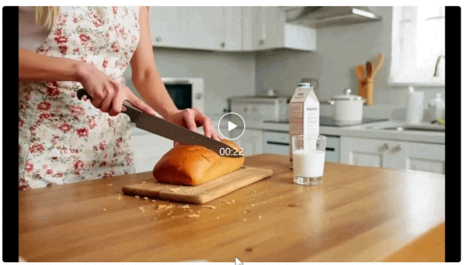 厨房明亮通风,白色橱柜和木质台面交相辉映。一块新鲜出炉的面包放在砧板上,旁边放着一个玻璃杯和一盒牛奶。一位身着碎花围裙的女士站在木质台面旁,熟练地用锋利的刀切着一块金黄色的面包。面包放在砧板上,她切的时候,面包屑四处飞溅。镜头拉远,女人放下手中的刀,伸手去拿牛奶盒,然后将其倒入桌上的玻璃杯中。女人放下牛奶盒。女人拿起牛奶杯,抿了一口。