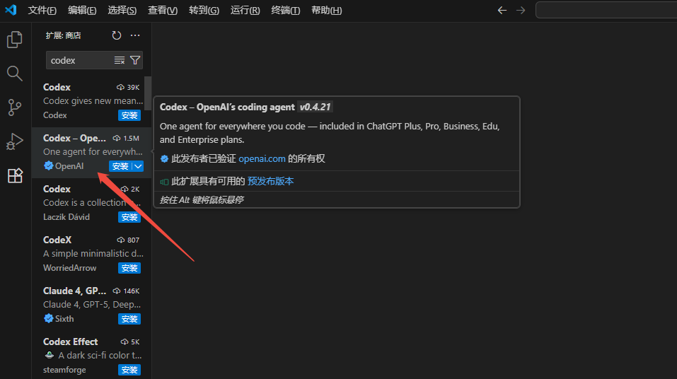 在VS Code或其他基于VS Code的IDE中搜索Codex,安装OpenAI官方插件: