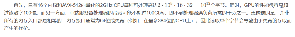 当涉及到单个GPU甚至CPU时,事情会更微妙一些:这些设备有多种类型的内存、通常情况下多种类型的计算单元以及在它们之间不同的带宽限制。例如,一个CPU有少量寄存器(register),L1和L2缓存,以及L3缓存(在不同的处理器内核之间共享)。随着缓存的大小的增加,它们的延迟也在增加,同时带宽在减少。可以说,处理器能够执行的操作远比主内存接口所能提供的多得多。