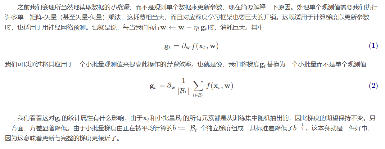 - 一般来说,小批量随机梯度下降比随机梯度下降和梯度下降的速度快,收敛风险较小。