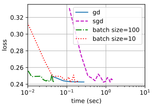 现在我们可以比较前四个实验的时间与损失。可以看出,尽管在处理的样本数方面,随机梯度下降的收敛速度快于梯度下降,但与梯度下降相比,它需要更多的时间来达到同样的损失,因为逐个样本来计算梯度并不那么有效。小批量随机梯度下降能够平衡收敛速度和计算效率。大小为10的小批量比随机梯度下降更有效;大小为100的小批量在运行时间上甚至优于梯度下降。