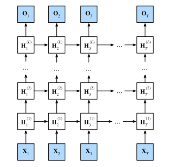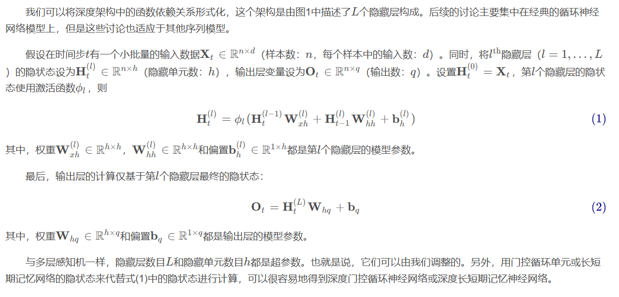 图1描述了一个具有$L$个隐藏层的深度循环神经网络,每个隐状态都连续地传递到当前层的下一个时间步和下一层的当前时间步。