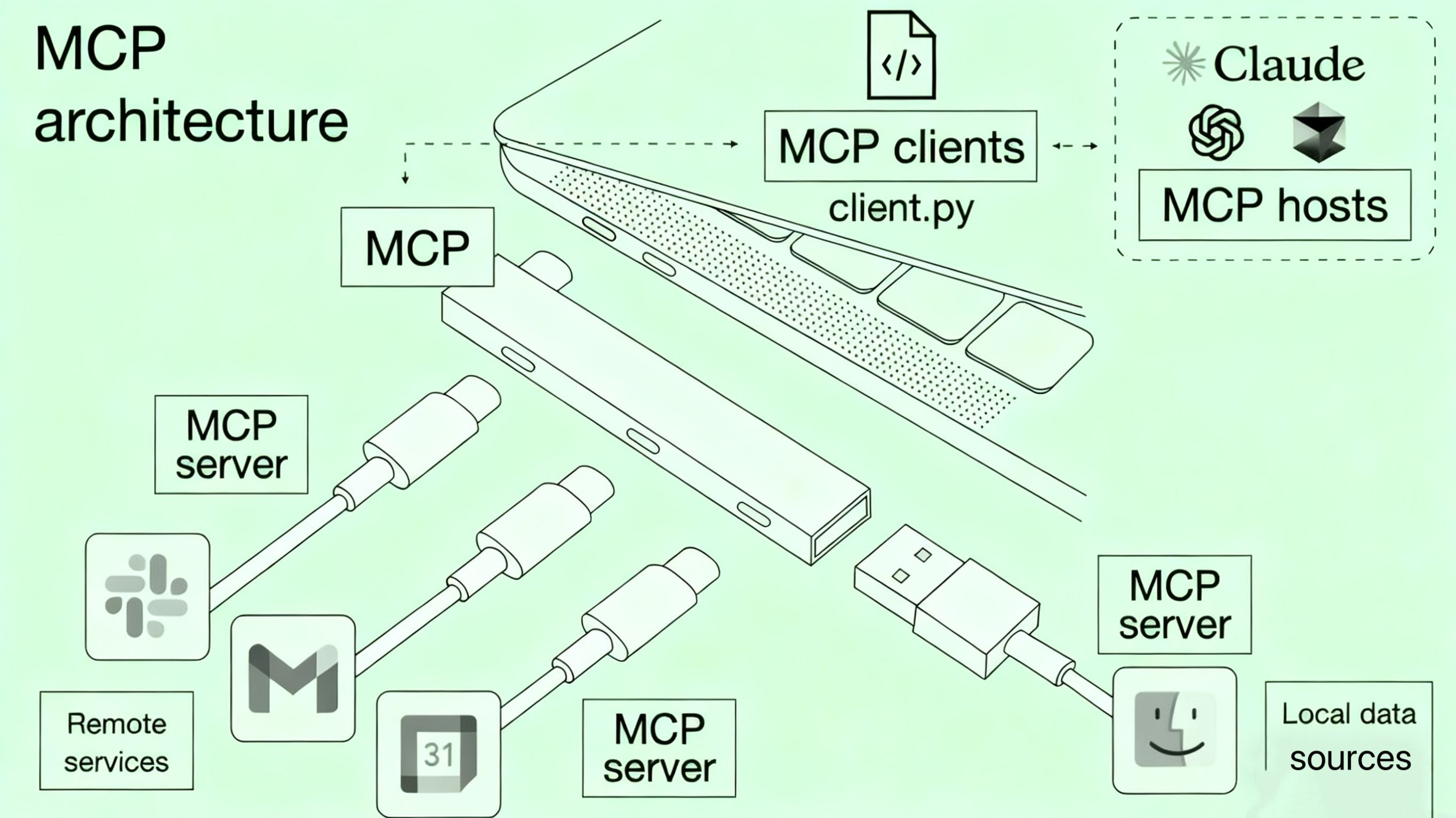 MCP是Anthropic公司搞的开放标准,核心目标就一个:让AI不用定制开发,就能对接任何数据源、工具和系统。说它是“AI集成领域的USB-C”一点不夸张——不管是数据库、API还是本地文件,插上就能用。