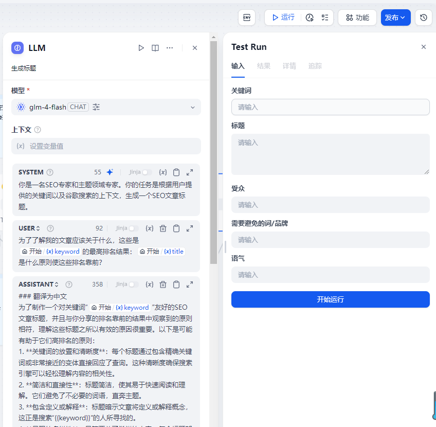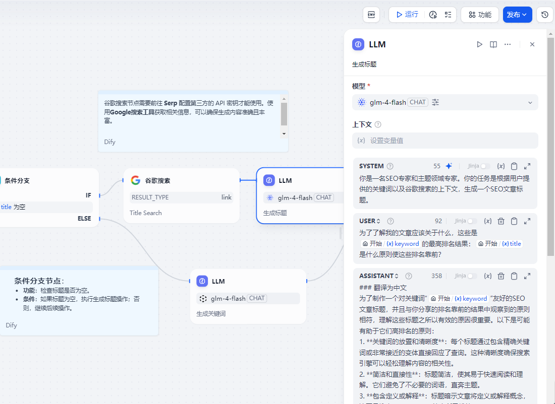 设置节点参数:每个节点都有相应的参数需要设置,以确定其具体的行为和功能。以 LLM 节点为例,需要设置模型供应商、模型版本、提示词等参数。在提示词设置中,可以使用变量来动态地替换输入内容,例如,提示词为 “请根据主题‘{主题}’生成一篇 500 字左右的文章”,其中 “{主题}” 就是一个变量,在工作流运行时,这个变量会被用户在开始节点输入的实际主题内容所替换。对于知识检索节点,需要设置关联的知识库、检索方式(如向量检索、全文检索)等参数,以确保能够准确地从知识库中获取相关知识。代码执行节点则需要设置编程语言、代码内容等参数,确保代码能够正确执行并返回预期的结果。在设置节点参数时,要仔细阅读每个参数的说明,根据实际需求进行合理配置,以保证工作流的正常运行和准确性。