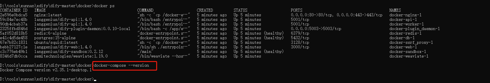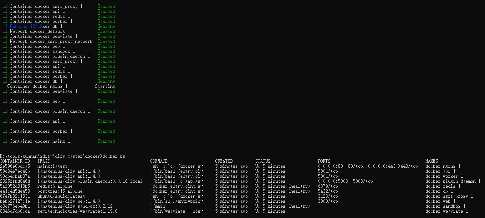 ,-d参数表示在后台运行容器。这个命令会根据docker-compose.yaml文件的配置,下载并启动 Dify 所需的所有容器,包括前端、后端、数据库、向量数据库等。