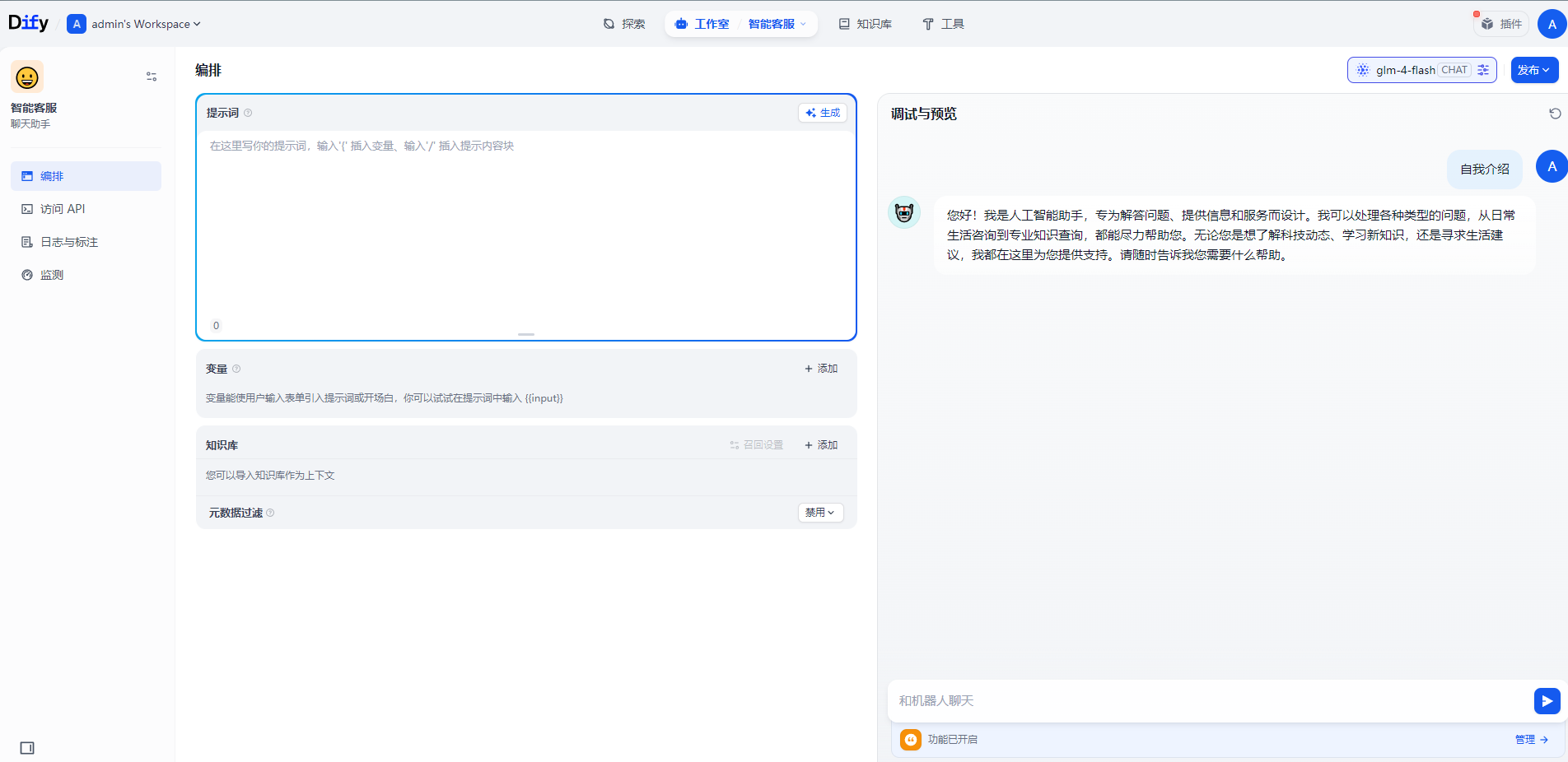 在使用操作方面,Dify 提供了丰富多样的功能。创建知识库,让 AI 智能体拥有了强大的知识储备,能够基于特定领域知识进行准确回答,就像一个无所不知的专家随时为我们提供专业的建议;构建智能体工作流,通过可视化的操作,将复杂的 AI 任务拆解为简单的节点组合,使我们能够轻松地实现各种复杂的 AI 应用逻辑,仿佛在搭建一座充满智慧的桥梁;创建图片生成应用和聊天机器人,更是让我们看到了 Dify 在不同领域的应用潜力,为我们的生活和工作带来了更多的便利和乐趣。