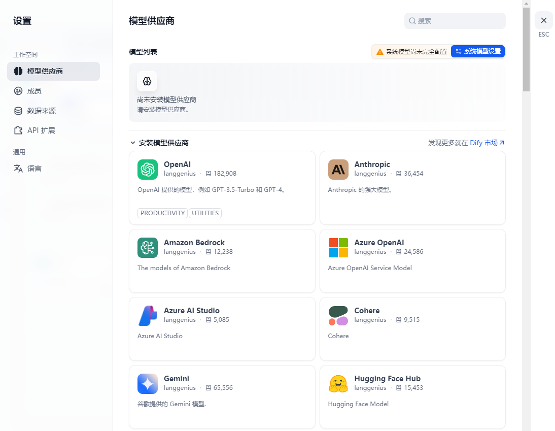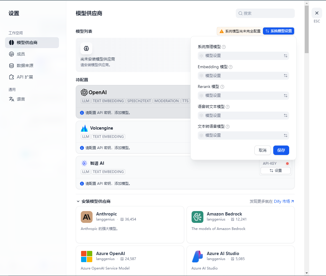 Dify 作为一款功能强大的 AI 智能体开发平台,对主流的模型供应商提供了广泛的支持,这使得开发者能够根据项目的具体需求和预算,灵活选择最适合的模型,为用户提供多样化的 AI 服务。以下是 Dify 支持的部分主流模型供应商: