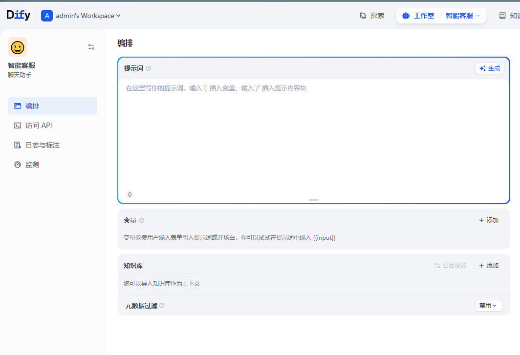 进入工作流编排界面:在 Dify 平台的 “工作室” 中,点击 “创建空白应用”,选择 “工作流” 类型,即可进入工作流编排界面。这个界面就像是一个可视化的编程画布,你可以在上面自由地组合各种功能节点,构建出复杂的 AI 工作流程。