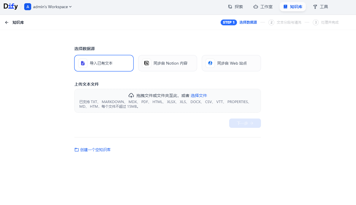 导入文本:这是一种简单直接的知识录入方式。点击 “知识库”,然后选择 “创建知识库”,在弹出的界面中选择 “导入已有文本” 选项。你可以将预先整理好的文本内容,如产品说明书、行业报告、常见问题解答等,直接粘贴到指定的文本框中。也可以通过上传文本文件的方式导入,Dify 支持常见的文本格式,如.txt、.md 等。导入文本时,还可以对文本进行一些预处理设置,如文本分段,合理的分段能够提高知识检索和匹配的效率,使 AI 在回答问题时能够更精准地定位相关信息。
