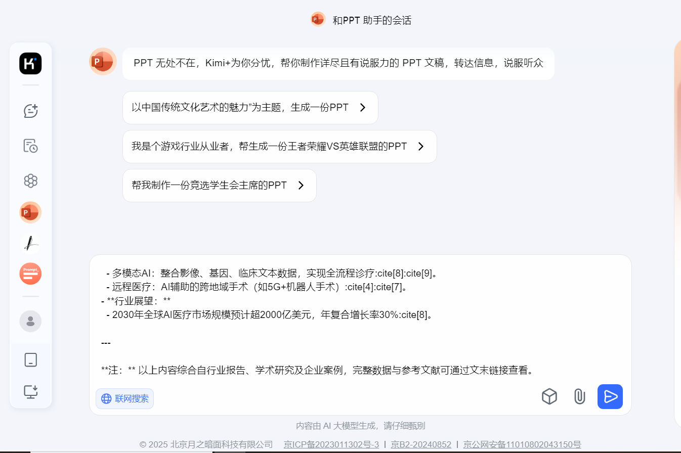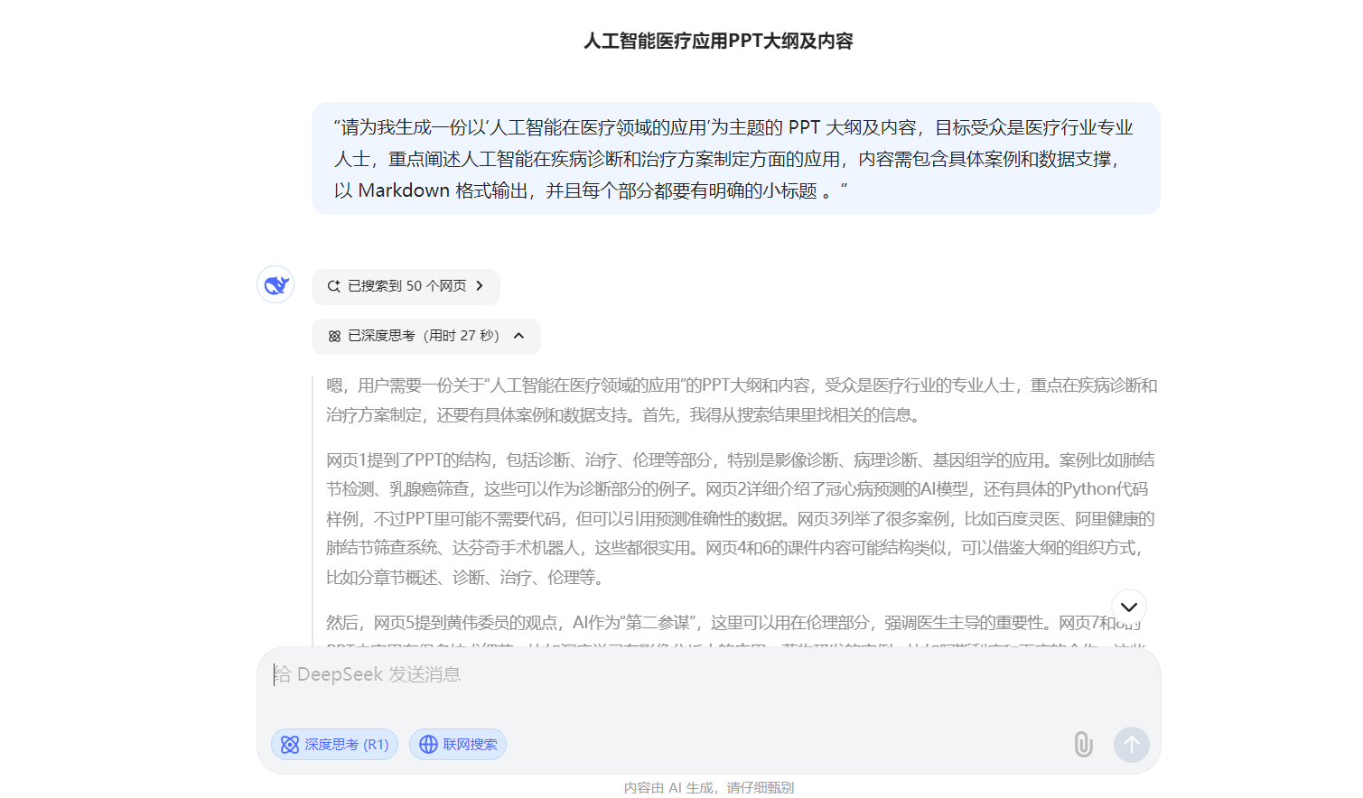 - 提高工作效率:DeepSeek 和 Kimi 的结合还能够极大地提高工作效率。在日常办公中,无论是撰写文档、制作 PPT 还是进行数据分析,这一组合都能为用户节省大量的时间和精力。在制作 PPT 时,用户只需在 DeepSeek 中输入 PPT 的主题和相关要求,DeepSeek 就能快速生成一份内容丰富、逻辑清晰的 PPT 大纲。然后,用户将大纲复制到 Kimi 中,Kimi 可以根据大纲自动生成精美的 PPT 页面,包括选择合适的模板、布局和图表等。整个过程只需短短几分钟,大大缩短了 PPT 的制作时间,让用户能够更加高效地完成工作 。