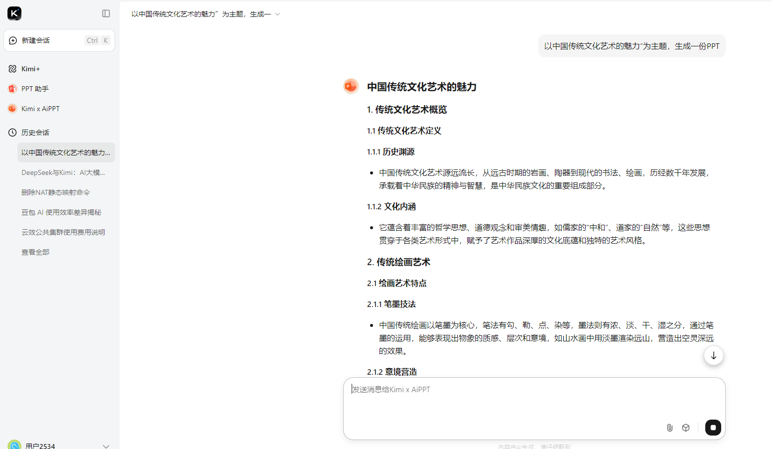 制作 PPT 是日常工作和学习中常见的任务,DeepSeek 和 Kimi 的结合可以让 PPT 制作变得更加轻松和高效 。用户首先在 DeepSeek 中输入 PPT 的主题、内容要点和风格要求,DeepSeek 凭借其强大的语言理解和生成能力,快速生成一份 PPT 大纲 。如果用户需要制作一份关于 “企业文化建设” 的 PPT,DeepSeek 可以生成包括企业文化的内涵、重要性、建设目标、建设方法、成功案例等内容要点的大纲,并以结构化的方式呈现出来 。