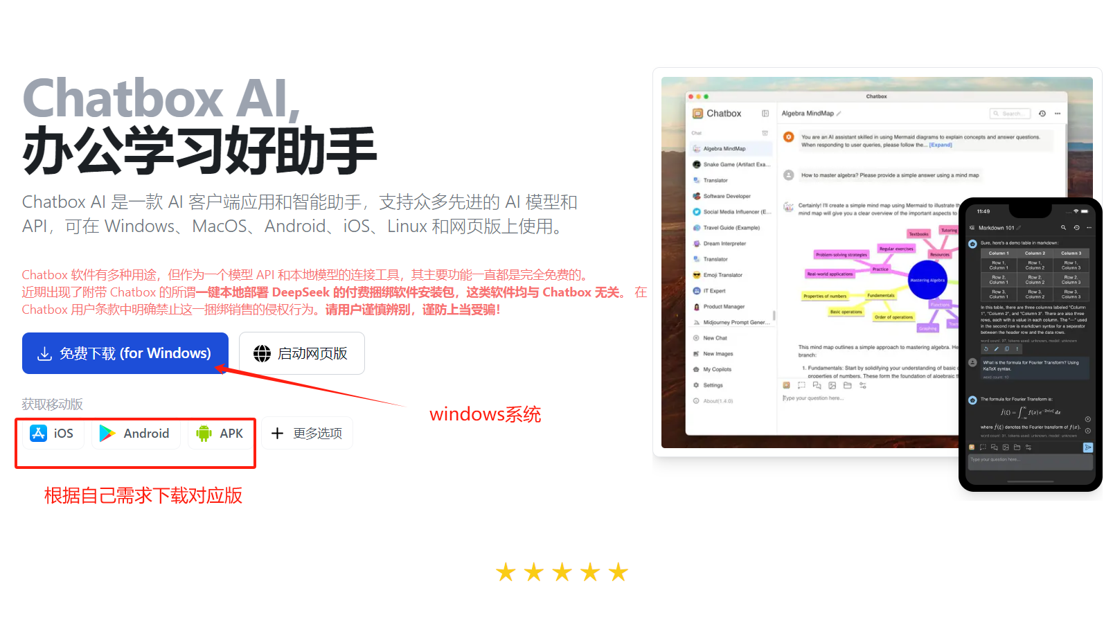 首先,打开您常用的浏览器,访问 ChatboxAI 的官方网站:Chatbox AI: Your AI Copilot, Best AI Client on any device, Free Download 。在官网首页,您会看到醒目的下载提示。根据您使用的设备类型,选择相应的下载选项。如果您使用的是 Windows 系统的电脑,