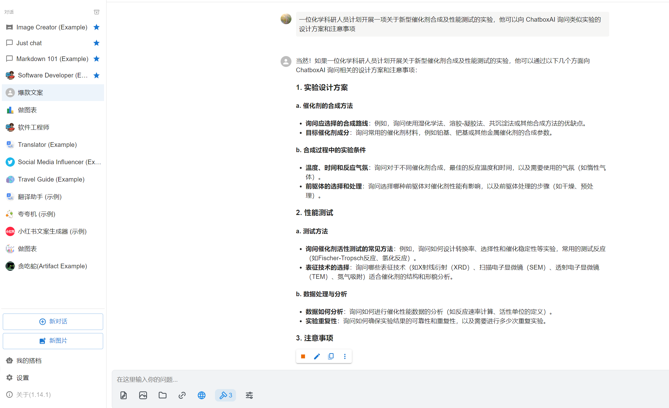ChatboxAI 的知识库在实验设计方面能为科研人员提供有力的辅助。在设计实验时,科研人员可以借助 ChatboxAI 知识库中存储的过往实验案例和相关理论知识,获取灵感和思路。例如,一位化学科研人员计划开展一项关于新型催化剂合成及性能测试的实验,他可以向 ChatboxAI 询问类似实验的设计方案和注意事项。ChatboxAI 会从知识库中检索出相关的实验案例,展示这些案例的实验步骤、所使用的仪器设备、实验条件控制等信息,为科研人员提供参考。同时,ChatboxAI 还能根据科研人员的具体研究目标和现有条件,提供针对性的建议,帮助他们选择合适的实验方法和实验样本。