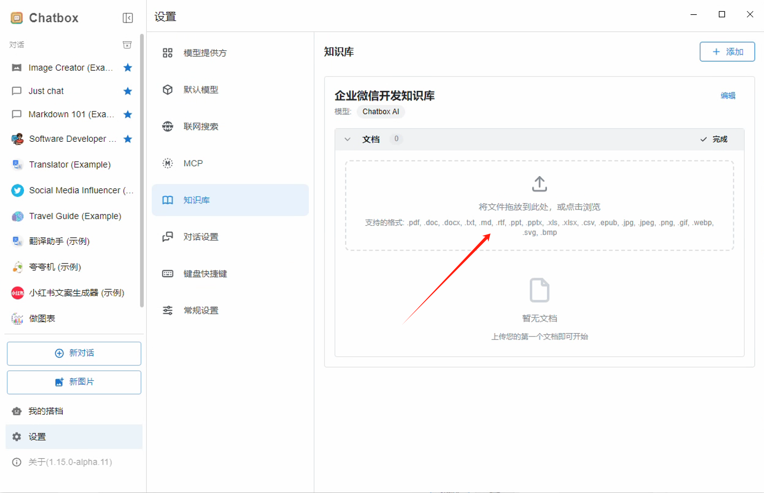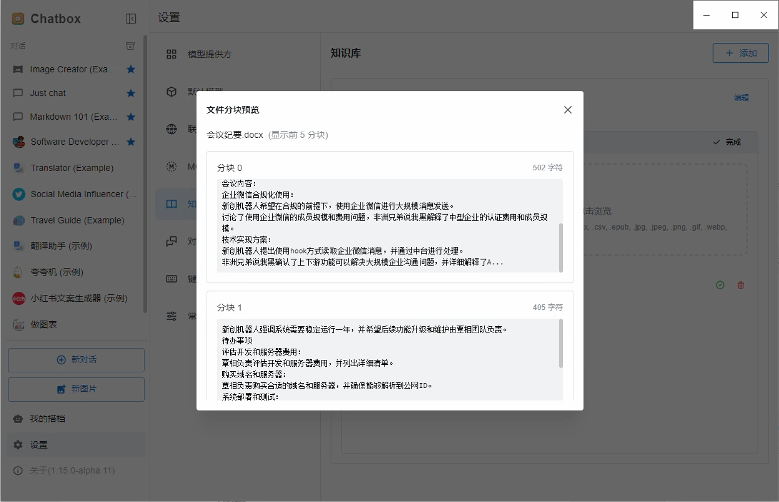 2.上传配置,在chatbox后台”知识库“管理选择文档类型,系统会自动处理成可查询的知识库。