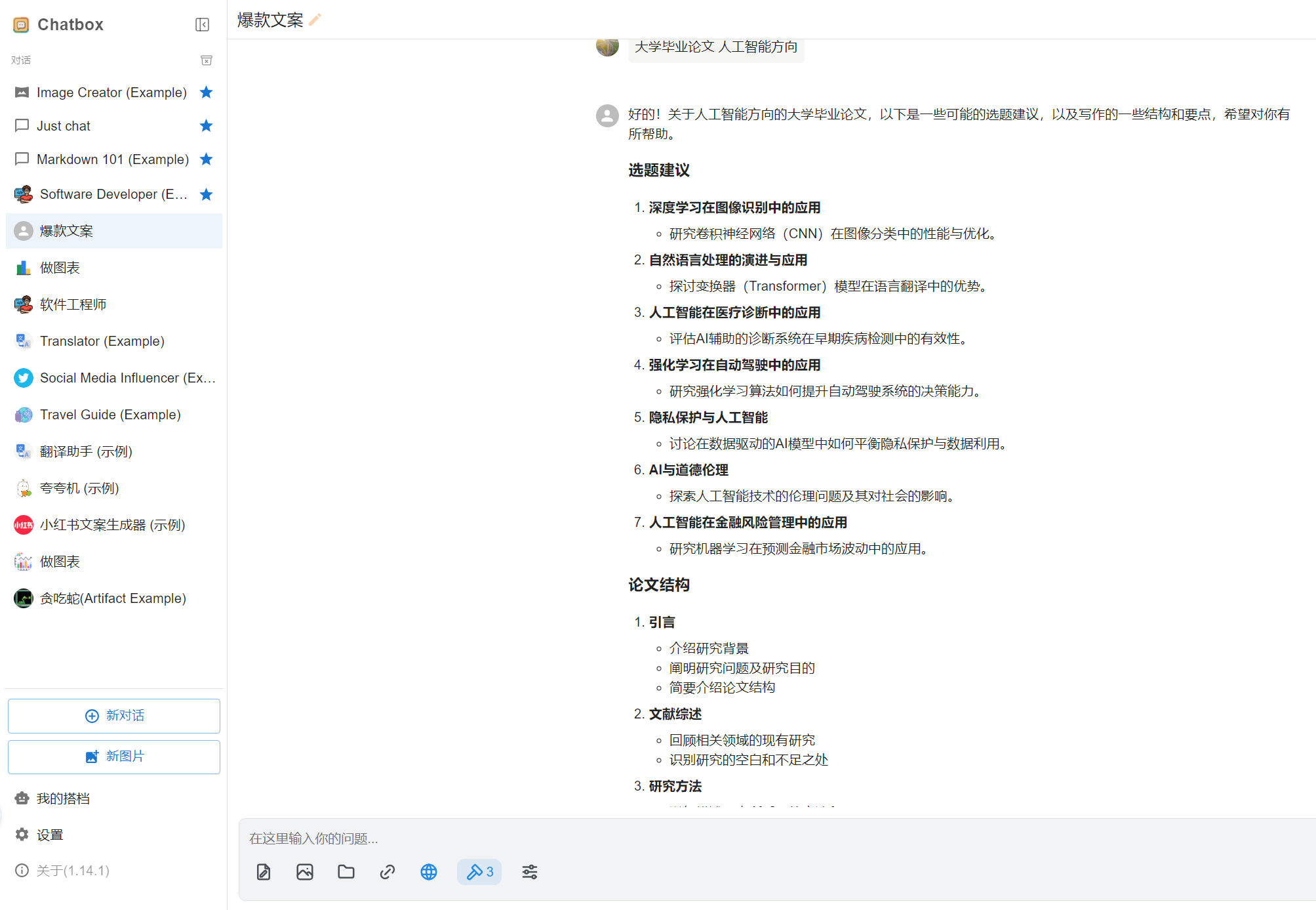 对于一些思路不够清晰的科研人员,ChatboxAI 还可以根据他们的研究思路和内容大纲,生成论文的部分段落甚至整个章节的内容。科研人员只需向 ChatboxAI 描述自己的想法和要求,它就能利用知识库中的知识和语言生成能力,为科研人员提供参考内容。当然,生成的内容还需要科研人员进行进一步的修改和完善,以确保其符合论文的整体逻辑和研究方向。通过这些功能,ChatboxAI 能够有效地提高论文撰写的效率和质量,帮助科研人员更好地展示自己的研究成果。