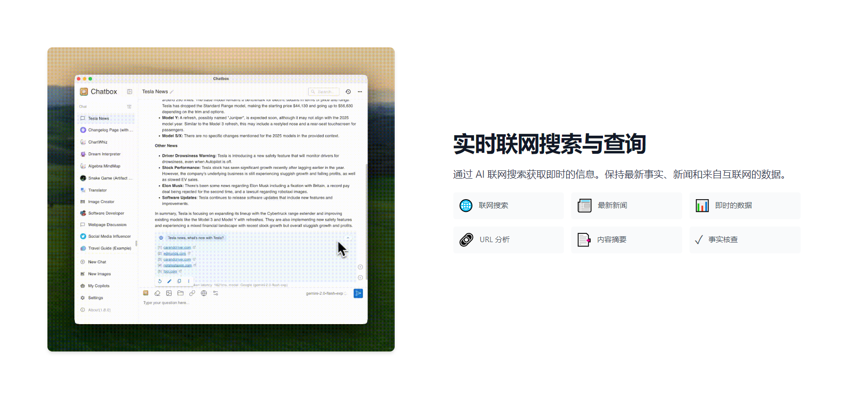 更为重要的是,ChatboxAI 的所有模型全部都支持联⽹搜索功能。这一特性使得科研人员在使用 ChatboxAI 时,能够及时获取最新的科研动态、前沿知识和研究成果。在科研领域,知识更新换代迅速,及时了解最新的研究进展对于科研工作至关重要。ChatboxAI 的联网搜索功能,让科研人员无需再花费大量时间在各种学术网站和数据库中搜索信息,只需通过 ChatboxAI,就能快速获取到最新的相关知识,为科研工作提供有力的支持。同时,无需翻墙即可使用的特点,也为科研人员带来了极大的便利,避免了因网络限制而导致的信息获取困难。