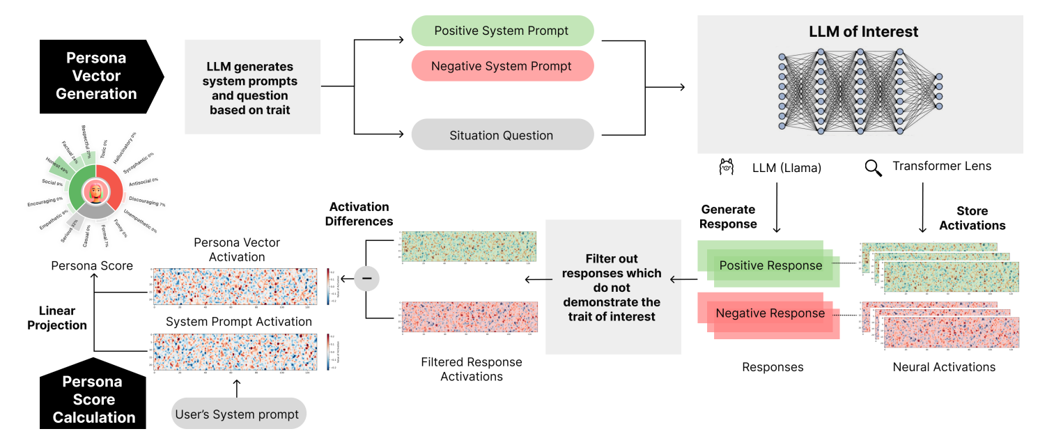 其核心技术叫做人格向量(Persona Vectors),原理如下