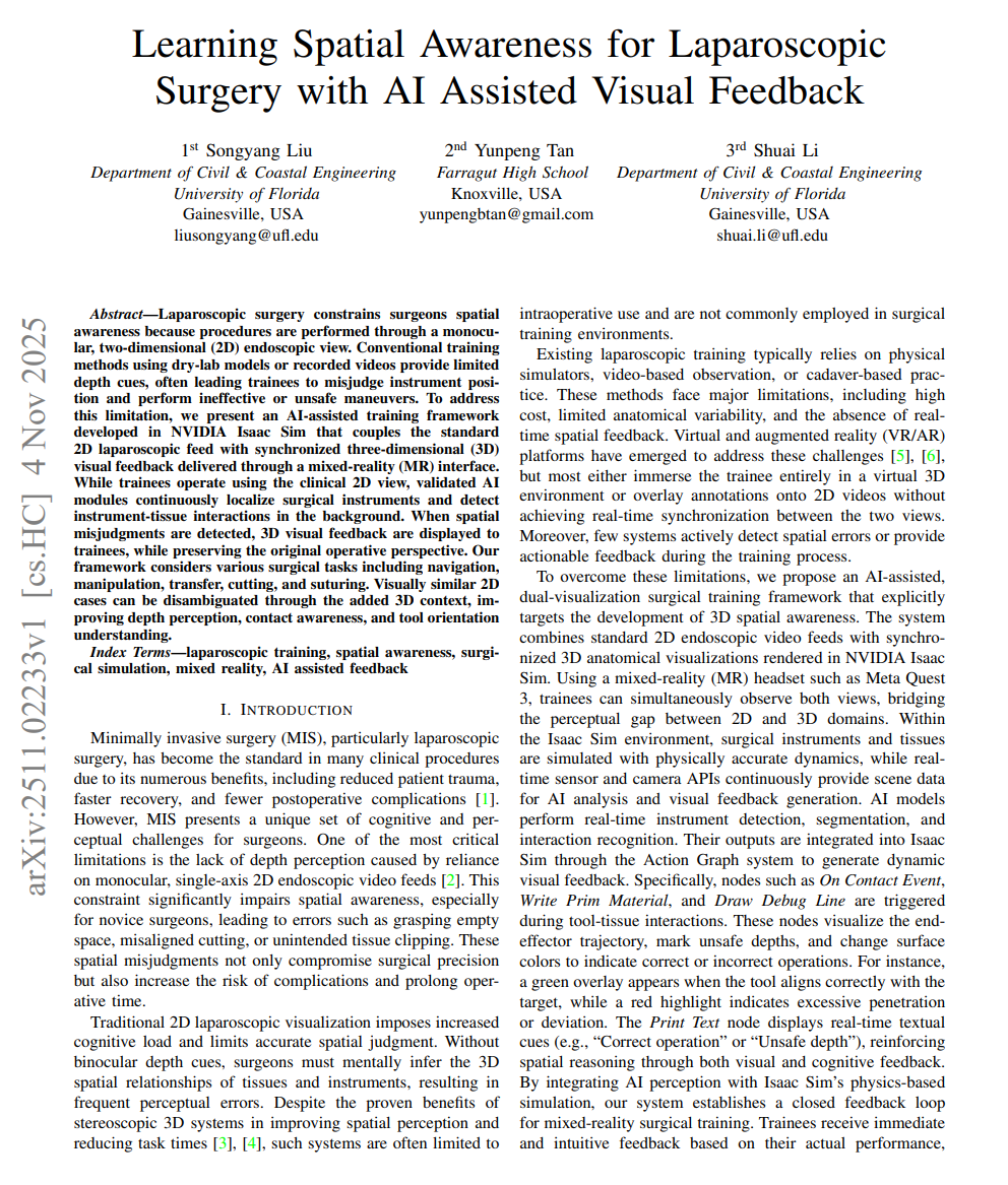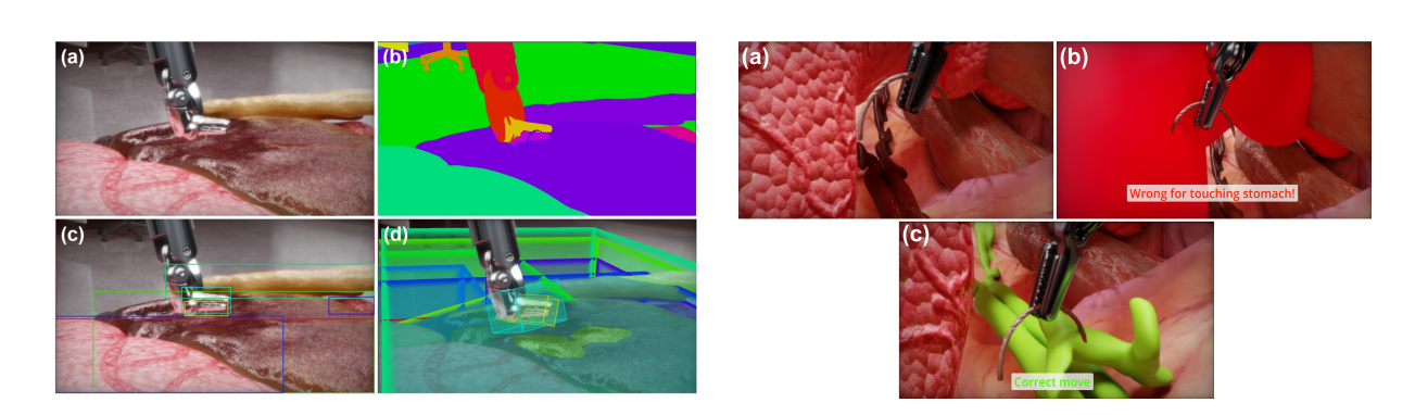 实时反馈:AI的分析结果被送入Isaac Sim的Action Graph系统,这是一个基于物理引擎的反馈机制 。当AI检测到潜在的空间错误或不安全操作时,系统会即时生成多模态3D视觉线索,但同时保留原始2D内窥镜视图作为主要操作参考。