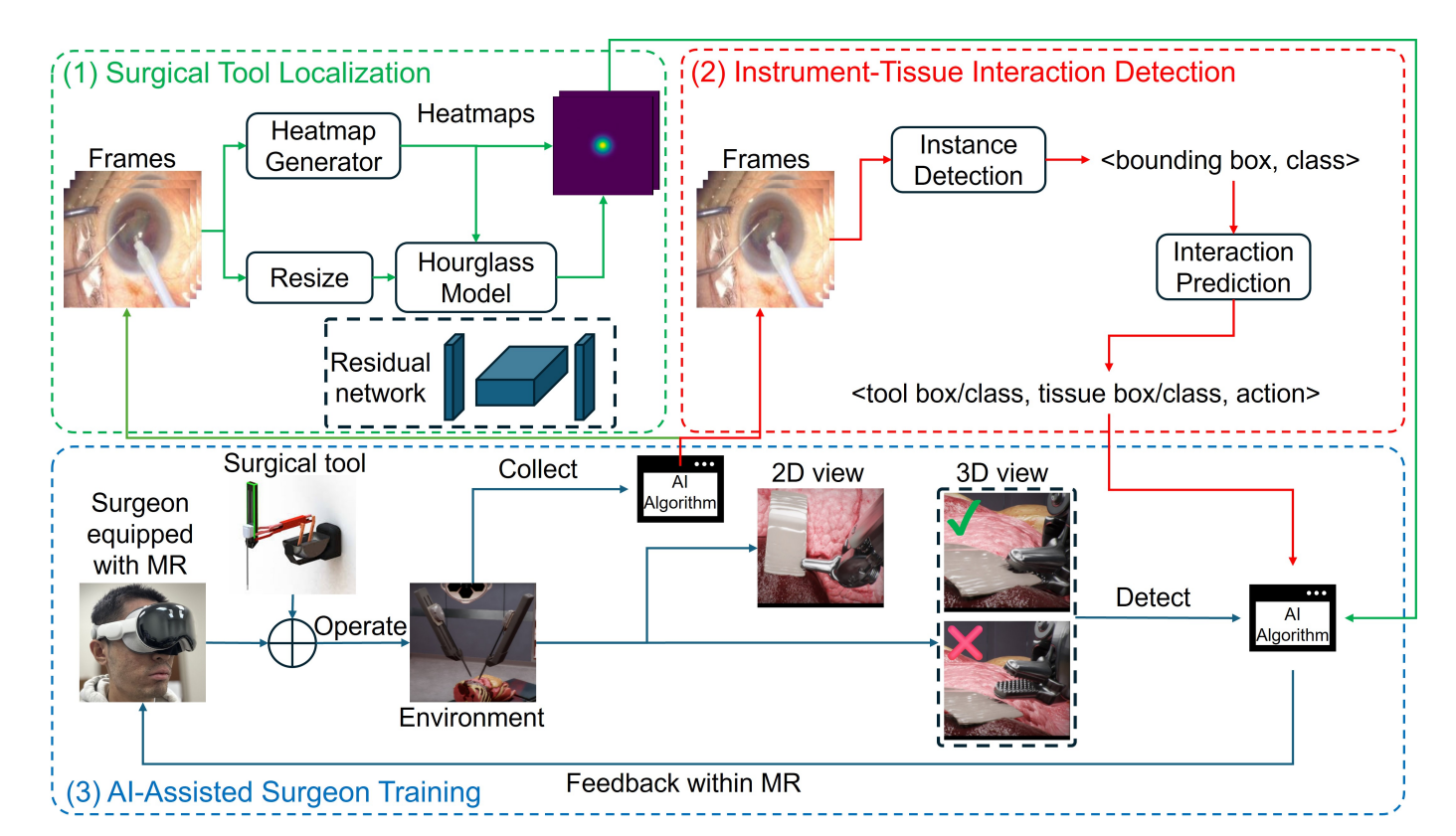 AI感知模块:通过Hourglass架构定位手术器械尖端位置,实现对器械的稳定实时追踪 ;同时也采用ITID-Net框架,识别器械和组织的交互状态。