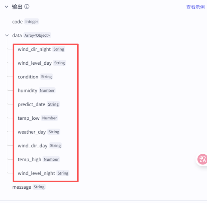 从示例中看到,我们需要的信息有:查询时间、整体天气、温度范围、湿度、早晚风向等,因此,我们在循环体中的文本处理节点的参数配置中,就需要配置如下参数来接收这些数值,这里我们可以返回“墨迹天气”插件,查看输出参数中的变量名,找到符合我们想要的,记录起来,在文本处理节点中配置好即可