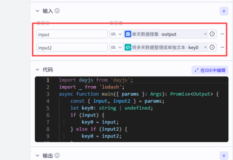 因为前面使用了条件分支,所以会从两个分支方向分别出来不一样的数值,只不过有一个分支会出现空值,如果直接将两个分支的节点都传输给最终的结束节点的话,那么呈现出来的结果会有一个空值,所以这里我们需要接入代码节点来做一个判断,将有数据的值传输给结束节点即可