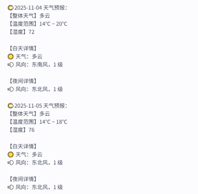 通过这个工作流,你不仅能够快速获取天气信息,还能根据个性化需求灵活调整查询范围和时间跨度,真正实现了天气预报查询的智能化和定制化。