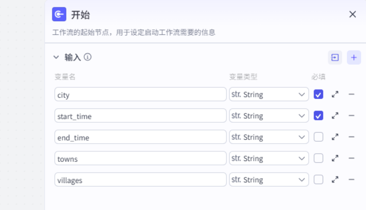 任何有效的查询都需要明确的输入条件。我们在工作流的开始节点设置五个关键变量:
