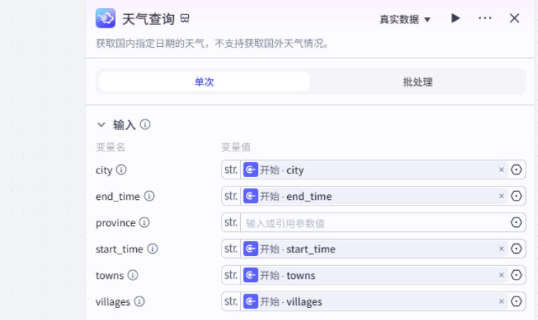 这五个变量就像是给系统下达的明确指令,告诉它我们需要什么地点、什么时间段的天气信息。设置完成后,系统就知道该去哪里、查询何时段的天气数据了。