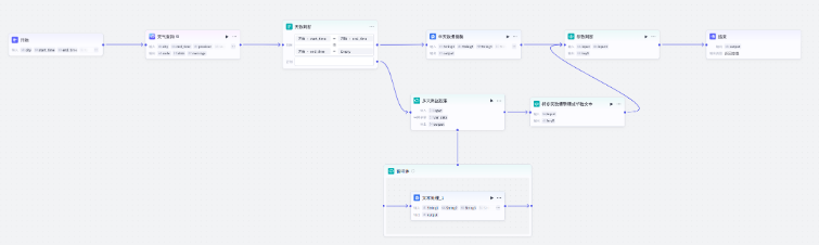 当查询多日天气时,系统会启动循环设置功能,逐日处理天气数据。循环完成后,这些分散的每日天气信息需要通过代码节点进行整合。代码节点会将多条天气记录汇总成一条完整的天气报告,保持信息的完整性和可读性。