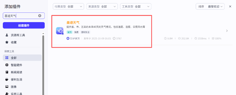 在 Coze 平台中,你可以轻松找到墨迹天气插件并将其接入工作流。配置插件参数时,只需将前面设置的五个变量映射到插件的对应输入字段即可。这个过程就像是给插件下达任务单,告诉它:“请根据这些地点和时间参数,给我相应的天气数据。”