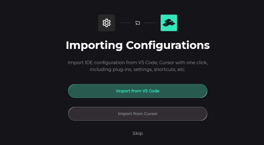 ② 在安装过程中,你可以选择是否导入 VS Code 的配置,我个人建议直接选择导入,这样能无缝对接你熟悉的工作环境。