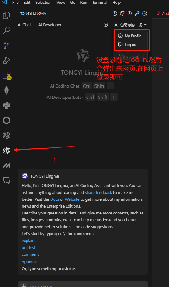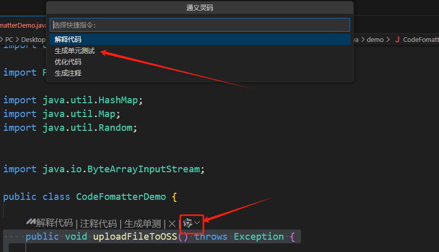**选中代码**,开始输入您的问题,通义灵码将围绕着选中代码与您开展对话;