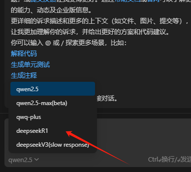 设置通义灵码的选项为DeepSeekR1就是通义灵码2.0 默认是:qwen2.5