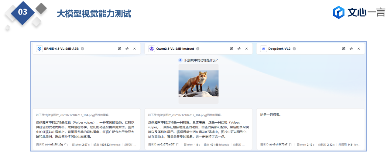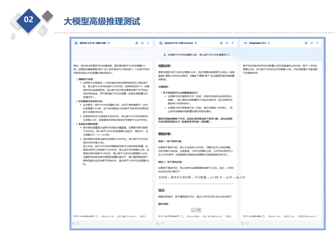 这里Qwen2.5的响应时间更短,但耗时方面ERNIE-4.5更优俩个模型不分上下,DeepSeek-VL2依旧是推理有些问题。