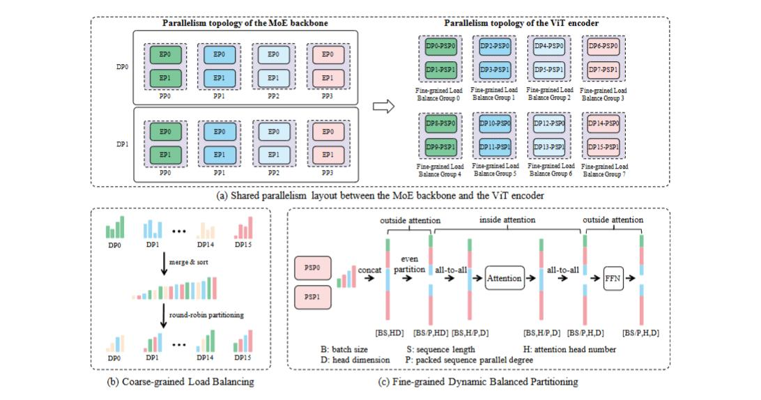 在层负载均衡策略这边采用了,粗粒度负载均衡和细粒度动态均衡分区, 对 ViT 编码器数据并行组令牌计数,借循环分区算法分发打包序列,实现粗粒度负载平衡;再在 attention 算子内外执行动态分区,进一步均衡负载 。
