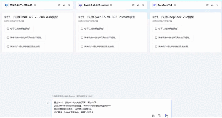 通过GIF相信各种都看到各个大模型的代码能力了。我们先从生成代码能力来分析一下 ERNIE-4.5-28B是本次给出的代码最全最完善大模型,其次是Qwen2.5-VL-32b的代码能力也还不错但是响应速度明显不如ERNIE-4.5-28B。