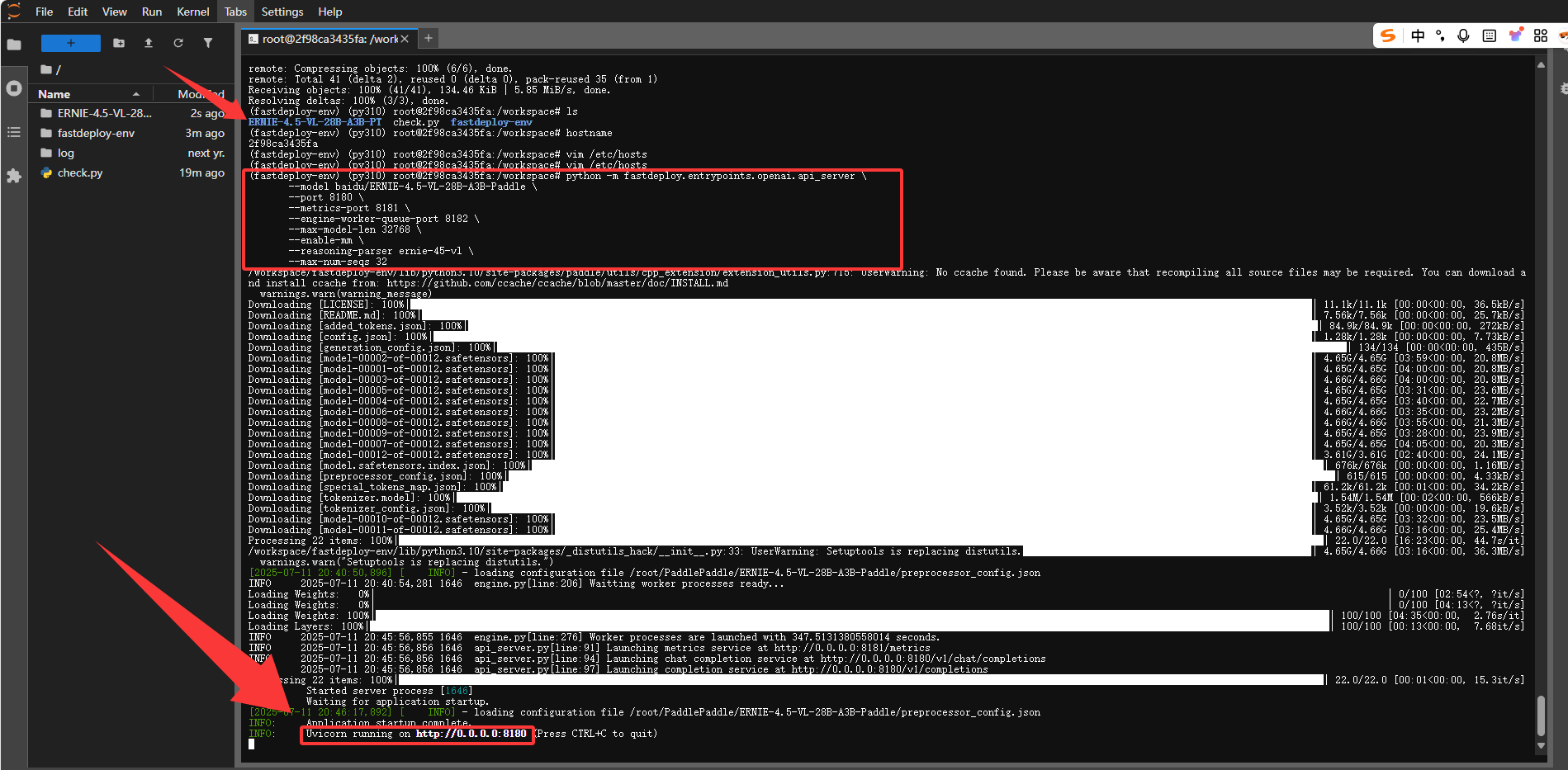 下载完fastdeploy工具我们就可以一键启动我们的ERNIE-4.5-VL-28B-A3B-Paddle了。