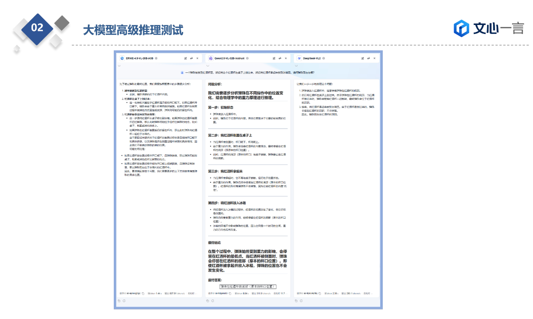 在这个问题里ERNIE-4.5并没有给出准确答案,而是向我们索要更多信息后再推理所以酌情给分1分。DeepSeek-VL2就有些逻辑混乱了回答弹珠在杯子顶部。