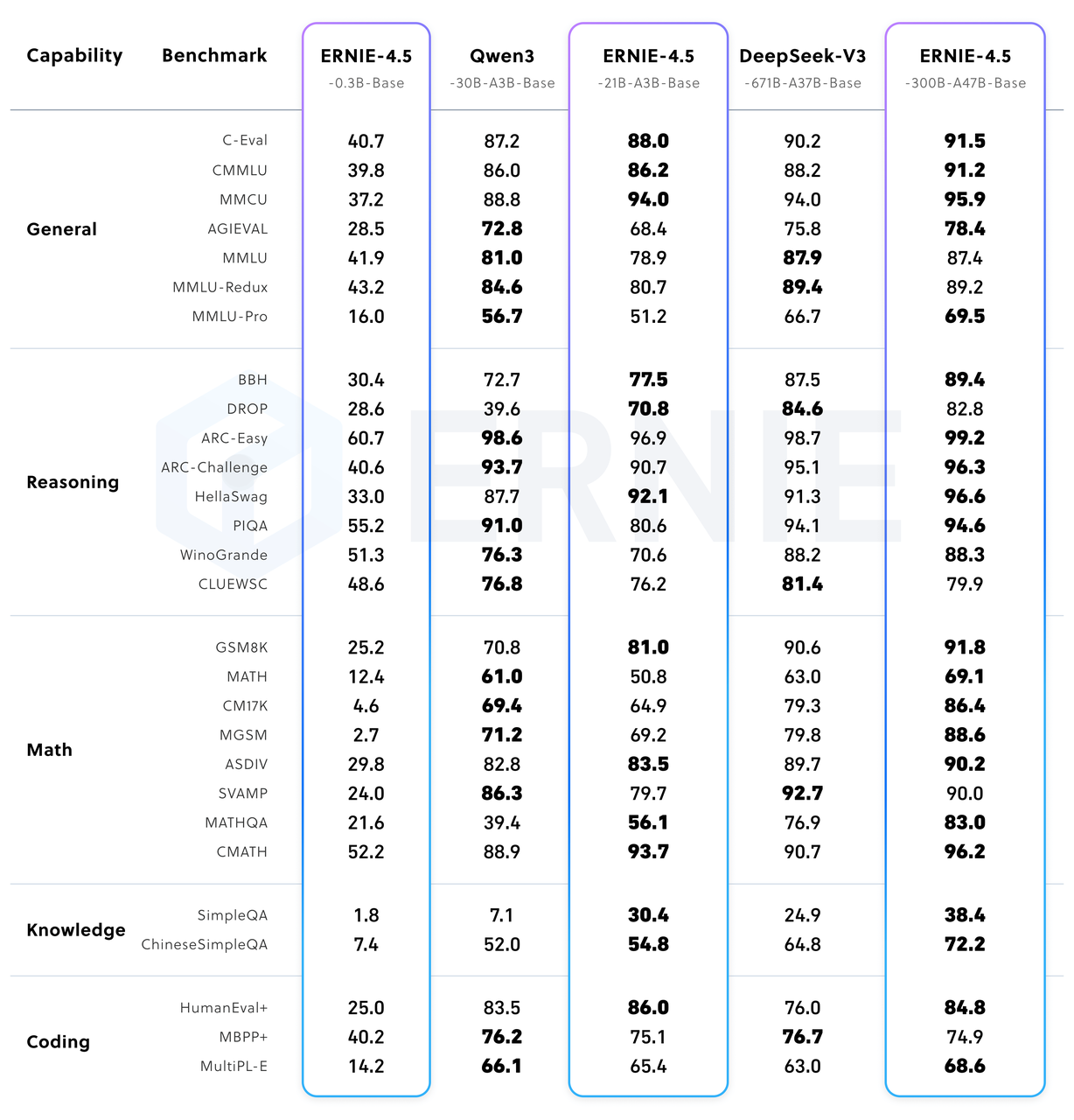 从上图我们可以看到文心 300B 的参数模型大幅超越了 Qwen3、DeepSeek-V3,但规模只有 DeepSeek-V3 6710 亿参数的一半,可谓是相当强悍了。